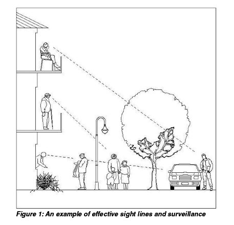 “Specifically, they will address security lighting, access control, surveillance, door contacts, blind spots and entrapment areas. They will define public and private spaces with good boundaries and provide for appropriate lighting and landscaping.