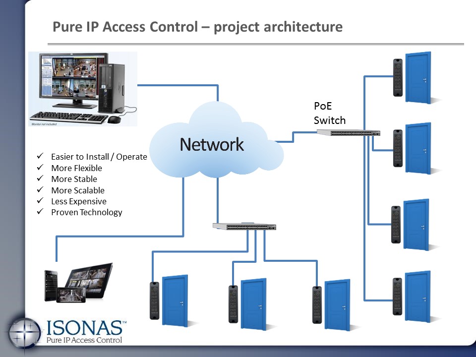 IP access control systems are now finding their way into the education market, including the Isonas pure IP access control system. The Isonas solution eliminates all dedicated wiring and control panels by moving the technology into a single 1x6-inch reader/control at the door. Power is delivered to the reader/controller and to the electric strike or mag lock via power over Ethernet (PoE). Costs are dramatically reduced because no other electricity is needed at the door; the only wiring is Cat-5 Ethernet cable. The Isonas PowerNet reader/controller has the ability to hold 64,000 credentials, 5,000 events and 32 different time schedules. A school, or an entire district, can program permissions centrally and push the data to the reader/controllers at the edge. If the network goes down, the access control system does not fail because all decision-making can be made by the reader/controller. The result is an access control system that is 30 percent less expensive, deployed more quickly, with more flexibility than traditional panel systems.