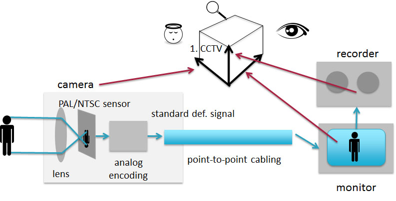 With the idea of value space in mind, we can see how traditional CCTV created value. This diagram to the right shows how the basic building blocks of a CCTV system map to each of the value vectors The live-view monitor provides awareness, the recorder provides evidence, and the camera’s physical presence affects the behaviour of those who are under its watch.