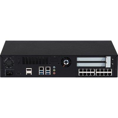USB 2.0, four USB 3.2 Gen1, audio interfaces. For megapixel IP cameras’ compatibility, there are 16 channels with 16 ports of 10/100 PoE for 802.3af and 8 ports for 802.3at. Finally, for stream accelerator support or AI application demands, there is an option to add full length PCIe cards.